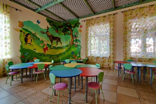· В детском зале: детский буфет, детские столы и стульчики, стерилизатор, подогревающее устройство для бутылочек, микроволновая печь, блендер.