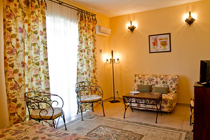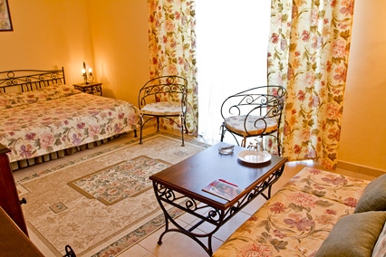 Мебель: две односпальные кровати/одна двуспальная кровать, прикроватные тумбочки,раскладной диван, шкаф, стол, стулья, зеркало.