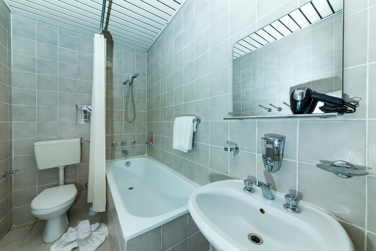 В ванной: ванна, фен, комплект полотенец: банное, для лица, для ног; на основные места: халат, тапочки, шапочка для душа, гостиничная косметика (по мере использования): шампунь-кондиционер, гель для душа, мыло.