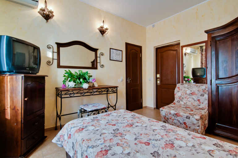 В номере: односпальная кровать, кресло-кровать, шкаф, туалетный столик, пуфик, мини-холодильник, телевизор, сплит-система, телефон (внутренняя связь), сушилка для белья.