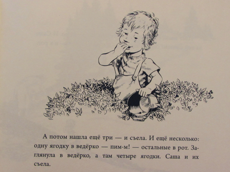 Мама Саши шла впереди и собирала ягоды в большое ведро. Ну а Саша: сорвет ягодку - и в рот, сорвет ягодку - и в рот. Вкусные видать ягодки.