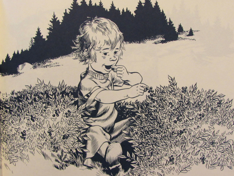 Как то летом девочка Саша (а глядя на рисунки в книге вот ни за что бы не сказала что это девочка. Натуральный мальчишка) вместе с мамой пошла на Черничную гору собирать чернику для варенья.