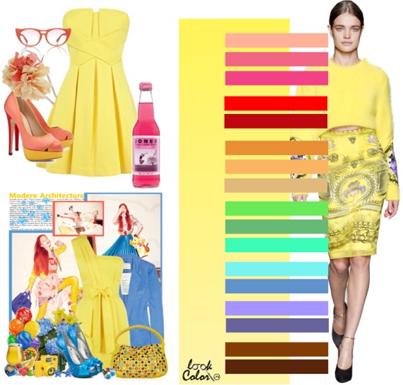 Сочетается бледно желтый в основном со сдержанными цветами. Такими как: мак, герань, жимолость, красный, темно красный, бледно оранжевый, оранжевый сорбет, песочный, золотой, салатовый, бледно зеленый, неоново зеленый, бирюзовый, джинсовый, сиреневый, серо сиреневый, коричневый, темно коричневый.