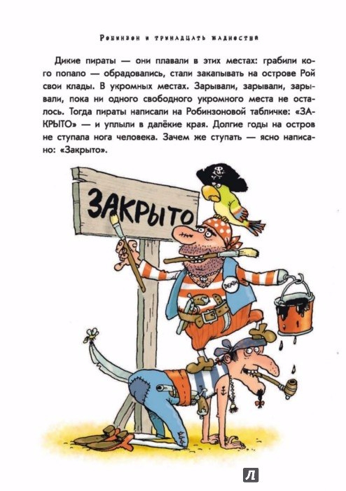 Повесть Г. Остера "Робинзон и 13 жадностей" - это отличная игра с сюжетом, в котором есть и пираты, и клады, и страшная эпидемия жадности, и даже любовь и свадьба. А ещё это очень весёлое пособие по управлению государством для начинающих президентов. А ещё - блестящие, неожиданные каламбуры и трюки со словами. И всё это вместе взятое с присущим ему остроумием помог изобразить на бумаге художник дядя Коля Воронцов.