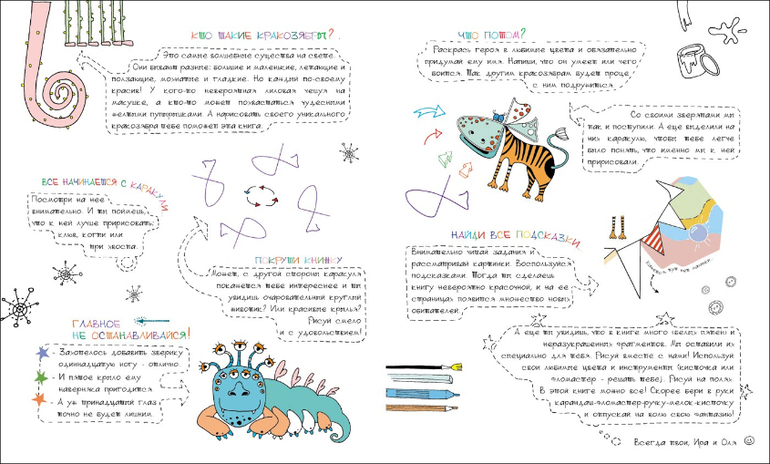 Смелые и веселые книжки-рисовалки, в которых простые каракули с помощью пары цветных штрихов превращаются в самых разных зверей и загадочных существ - «кракозябр».