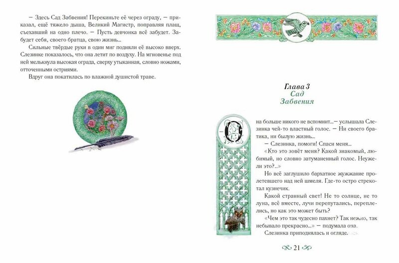 "Кажется, этому саду никогда не будет конца. А чуть поодаль наклонились над тропинкой цветущие кусты. Сирень, она сама собиралась в букеты, и рвать не надо. Слезинка шла, раздвигая цветы. Их становилось все больше, и каждый цветок был таинственно и незнакомо прекрасен.