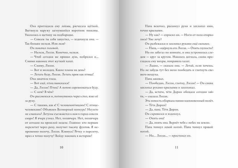 Человек с крыльями! Любимая тема Дэвида Алмонда, на этот раз в комическом варианте: папа девочки Лиззи решил, что он — человекоптиц. А в город как раз съехались на соревнование летуны со всего света! И Лиззи, которая приглядывает за отцом как за безответственным ребёнком, не выдерживает: ей тоже хочется смастерить крылья и полететь вместе с папой. Да что там! Полетит даже директор школы, мистер Ирис! Лишь тётушка Дорин сохранит остатки здравомыслия, но... похоже, она тоже мечтает о полётах.