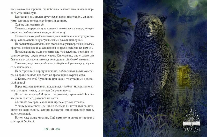 "Как странно... И пить не хочется, - подумала Слезинка. - Как здесь хорошо, я хотела бы остаться тут навсегда. Я слышала, что на свете бывает какое-то счастье. Но не знаю, что это такое! Наверное, когда на душе свет и радость...""