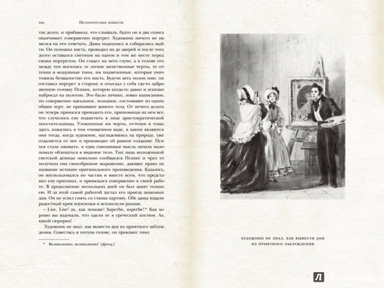 Неслучайно повесть "Невский проспект" стоит первой в этом сборнике, противопоставляя внешнюю красоту и напыщенность северной столицы с внутренней пустотой ее обывателей. Издание выполнено с тиснением на обложке, содержит ляссе (ленточку-закладку).