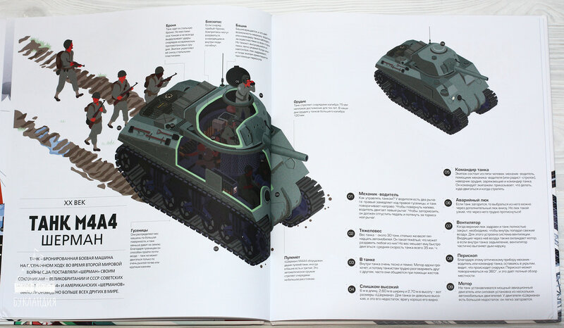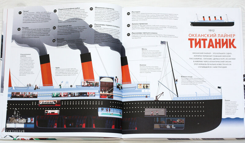 Вся техника представлена в разрезе на большущих разворотах книги. Можно заглянуть в вагоны Восточного экспресса, увидеть, как располагались и были устроены кухня, ресторан, спальные вагоны, «прогуляться» по каютам Титаника, а в нем нашлось место и спортивному залу, и теннисному корту, и бассейну. Представить себя пассажиром Аэробуса А380, служащим бродячего цирка, специалистом передвижной криминалистической лаборатории. Все основные части, детали техники подписаны и дополнены комментариями, не только понятными, но интересными детям