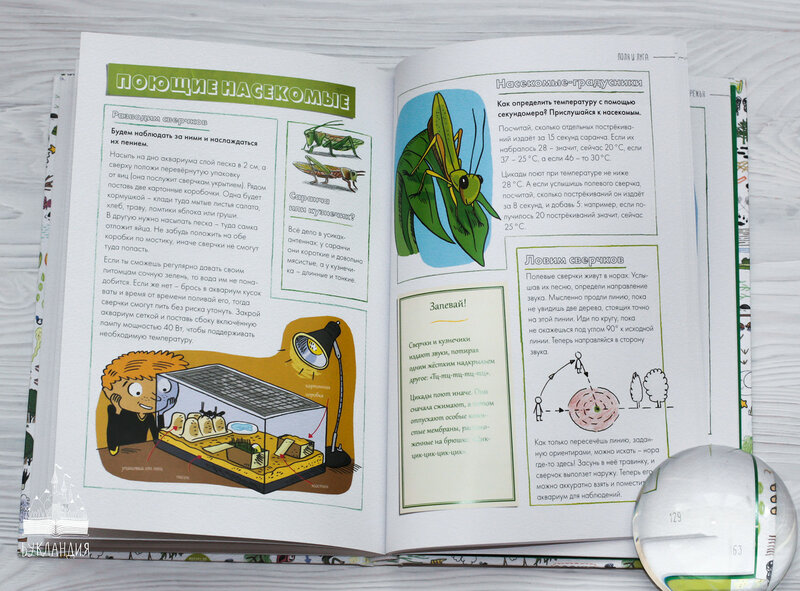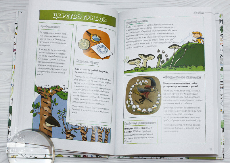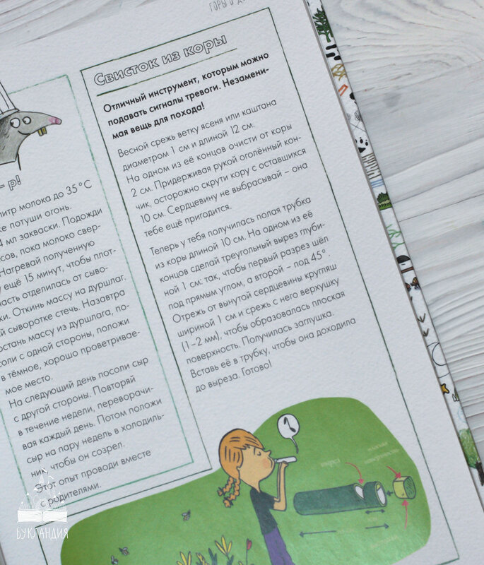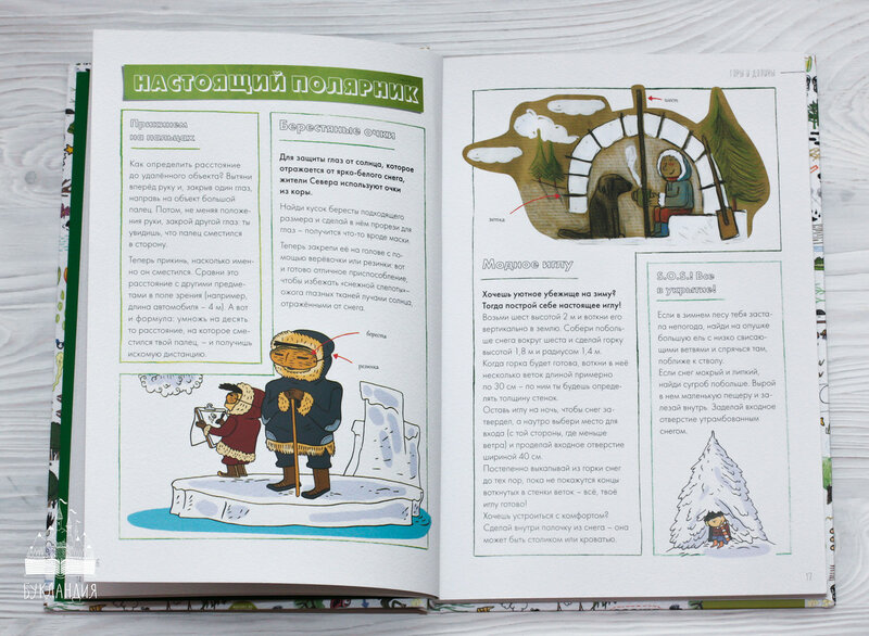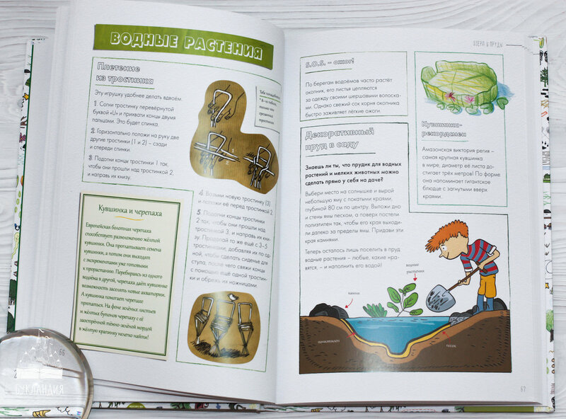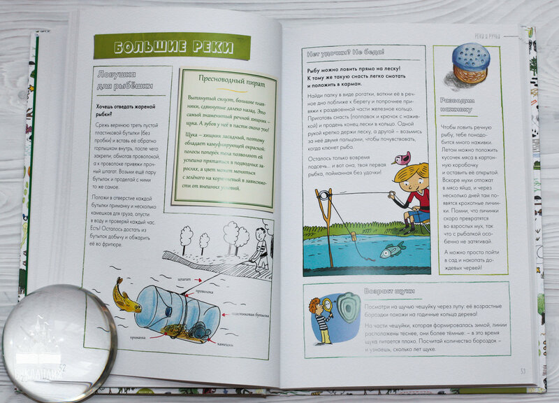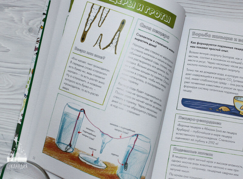 Как отличить сталактиты от сталагмитов, как распознать животное по следам его пребывания, как сделать дудочку из тростника, как собрать метеоритную пыль, как правильно сфотографировать снежинку, где лучше поставить палатку, а также подробнейшие описания растений, животных, и их отличия. Всего и не перечислить, книга довольно-таки приличная по толщине. И все же, это не совсем обычная энциклопедия о природе, на каждой странице помимо интересной информации, вы найдете опыты, игры, практические занятия, задания, поделки и еще очень много всего, чем можно заняться в лесу, на пруду, у речки, в городе, в саду, на море или в горах. Причем, все задания не сложные и вполне осуществимые как в походных, так и комнатных условиях. Например, вырастить сталагмит, сталактит или кристалл, вырезать свисток, дудочку или манок, сплести подставку для посуды из ивовых прутьев, смастерить флюгер или домик для летучих мышей, да много еще чего! Самое интересное в том, что в этой книге нет ни одной не интересной страницы, да и информация подана понятно и доступно, свою изюминку добавляют немного смешные иллюстрации. Издание очень качественное – твердый переплет, плотные мелованные страницы, отличная полиграфия