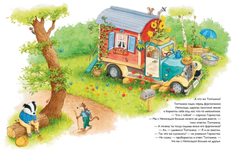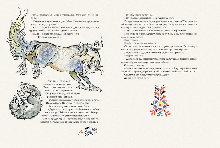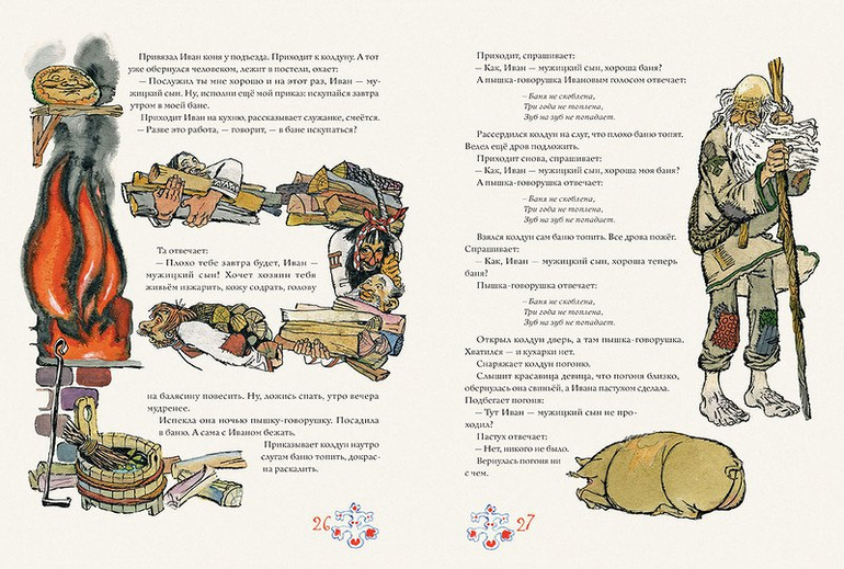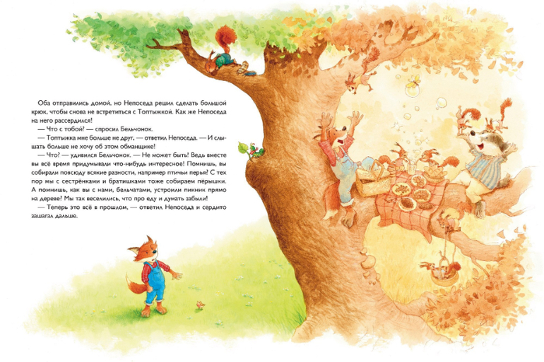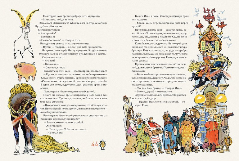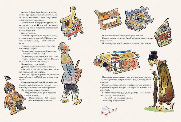 Книга рисовалась что называется "в макет". Поменять что-либо в таких книгах невозможно, там все рисунки рассчитаны именно под этот текст и именно под такое расположение на полосе. Мы позволили себе только дать более обтекаемую линию текстовых блоков вокруг рисунков - ранее, во внекомпьютерное время - это было невозможно технически, сейчас - просто. За счет этого получилось чуть увеличить размер шрифта (в изначальном варианте он был мелковат), а рисунки с текстом стали восприниматься более цело и едино.