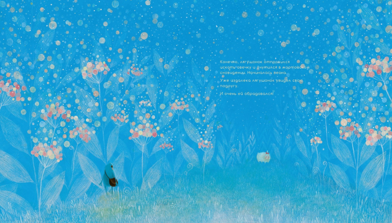 Пройдя от цветущего майского луга до звёздного августовского неба, преодолев ноябрьский дождь и январский снег, лягушонок узнаёт, о чём мечтают другие. И сам учится мечтать.