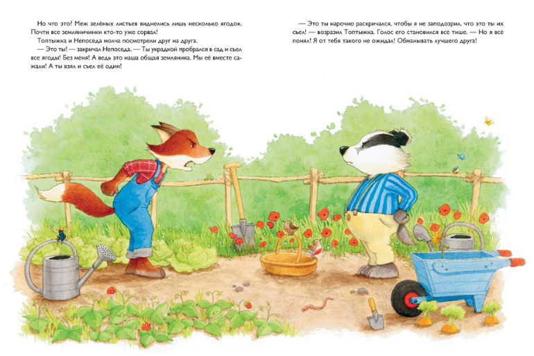 И вдруг дружбе пришёл конец: земляника, которую они вырастили вместе, внезапно исчезла. Непоседа считает, что её сорвал Топтыжка. Топтыжка обвиняет Непоседу. Они больше не хотят иметь друг с другом ничего общего.