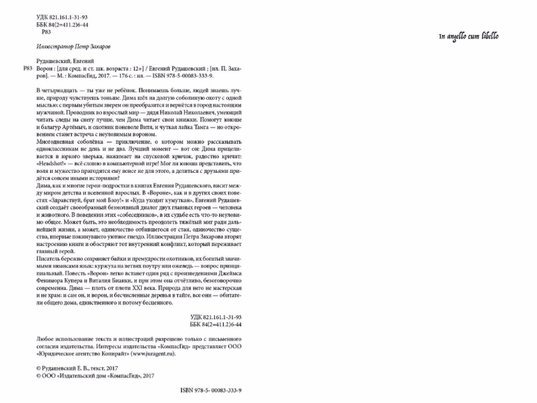 Дима, как и многие герои-подростки в книгах Евгения Рудашевского, висит между миром детства и вселенной взрослых. В "Вороне", как и в других своих повестях "Здравствуй, брат мой Бзоу!" и "Куда уходит кумуткан", Евгений Рудашевский создаёт своеобразный безмолвный диалог двух главных героев - человека и животного. В поведении этих "собеседников", в их судьбе есть что-то неуловимо общее. Может быть, это необходимость преодолеть тяжёлый миг ради дальнейшей жизни, а может, одиночество отбившегося от стаи, одиночество существа, впервые покинувшего уютное гнездо. Иллюстрации Петра Захарова вторят настроению книги и обостряют тот внутренний конфликт, который переживает главный герой.