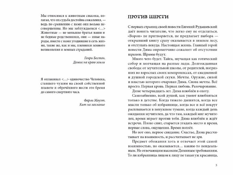 Писатель бережно сохраняет байки и премудрости охотников, их богатый значимыми нюансами язык: куржуха на ветвях поутру или ожеледь - вопрос принципиальный. Повесть "Ворон" легко встанет один ряд с произведениями Джеймса Фенимора Купера и Виталия Бианки, и при этом она отчётливо, безоговорочно современна. Дима - плоть от плоти XXI века. Природа для него не мастерская и не храм: и сам он, и ворон, и бесчисленные деревья в тайге, все они - обитатели общего дома, единственного и потому бесценного.