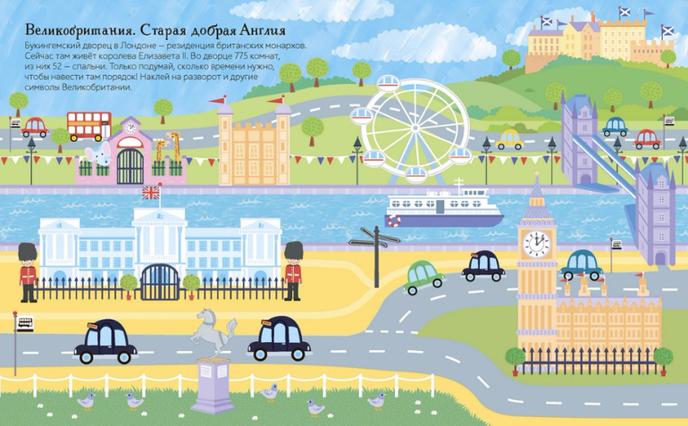 В этом красочном стикербуке вас ждут интересные факты о Великобритании, Китае, Италии, России, Бразилии, Австралии, Испании, Индии, США, Египте, Франции и Греции.