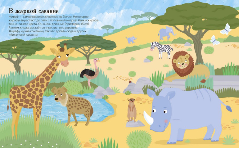 Познакомься с животными со всего мира в этом ярком стикербуке! Кто живёт в саванне, а кому место в морских глубинах? Кто любит холод полюсов, а кто - жару Австралии? Кто летает по небу, а кто прячется под землёй? Помоги животным найти свои места обитания!