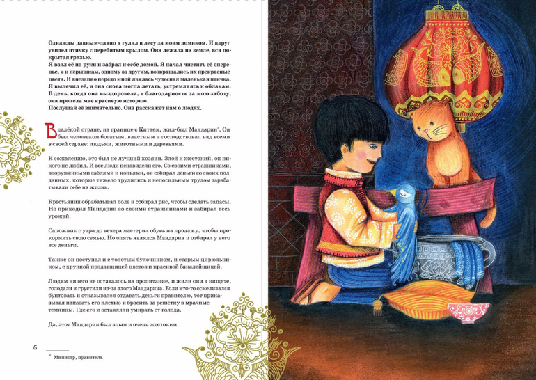 В далёкой стране, на границе с Китаем, жил-был Мандарин. Он был человеком богатым, властным и господствовал над всеми в своей стране: людьми, животными и деревьями. К сожалению, это был не лучший хозяин. Злой и жестокий, он никого не любил… Но однажды он встретил чудесную маленькую птичку, которая изменила всю его жизнь…