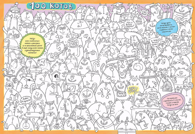 Каждый разворот содержит большое количество персонажей и деталей, посвящённых одной теме. Коты, феи, цветы, принцессы, морские обитатели, сладости, совы, гномы, единороги - всех их нужно раскрасить, на их загадки - ответить, потерявшихся персонажей - найти. А ещё на каждой странице этой раскраски спрятался очень ловкий и хитрый кот. Найти его довольно трудно. В конце книги даже есть подсказка для тех, кто так и не обнаружил этого ловкого мурлыку на страницах раскраски.
