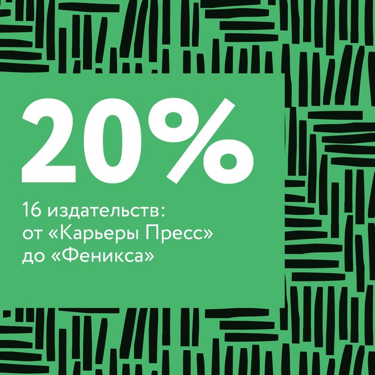 На книги 16 издательств действует доп.скидка 20%: «Эксмо», «Эксмо-Пресс», «Манн, Иванов и Фербер», «Терра», «Вече», «Книговек», «Никея», «Искусство XXI век», «Карьера Пресс», «Попурри», «Проспект», «Питер», «Феникс», «Кучково поле», «АСТ-Пресс», «Аякс-Пресс» и некоторые книги издательства «Зебра-Е».