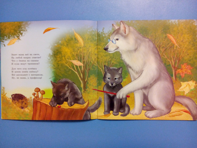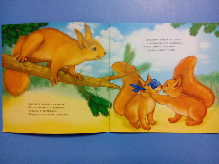 На каждом развороте в книге одно животное - мама-белка и бельчонок, мама-волчица и волчёнок, мама-слон и слоненок, мама-жираф и маленький жирафик