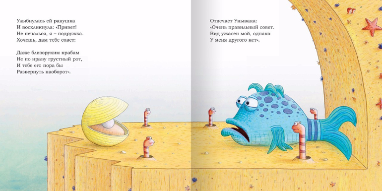 Страницу за страницей маленький читатель наблюдает за тем, как все подводные жители стараются подбодрить рыбку-унываку. Но унывака глубоко убеждена, что ей суждено всегда быть в плохом настроении. Преувеличенные чувства рыбки выглядят смешно, но в то же время поучительно. И вот однажды мы видим, как маленький повод внезапно становится причиной больших улыбок!