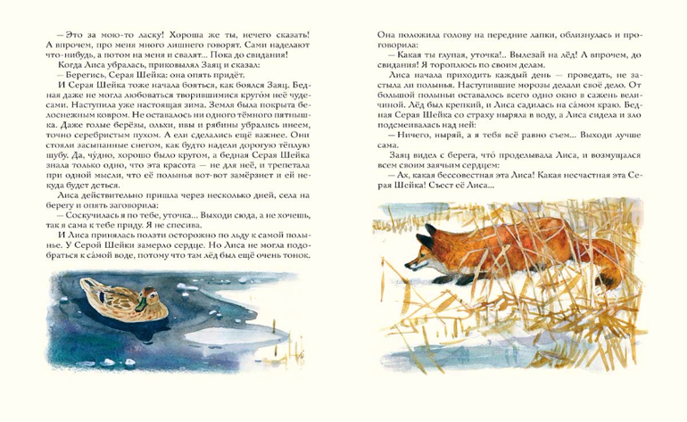 Серой Шейке предстоит провести холодную зиму совсем одной. Все её сородичи улетели в тёплые края. Но она не отчаивается и даже находит друга - Зайца. Всё бы ничего, но только к реке начала приходить Лиса… Сможет ли уточка со сломанным крылышком спастись от коварной Лисы? Любимую многими сказку проиллюстрировал художник, тонко чувствующий и понимающий природу, - Георгий Никольский.