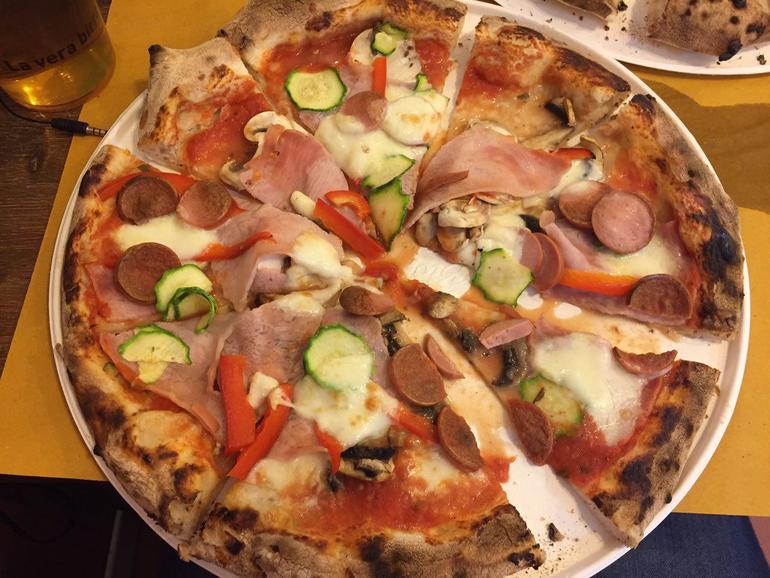 Но какая же там божественная пицца! Говорят, что самая вкусная пицца в Италии - в Неаполе. Но в Неаполе я такой вкусноты не ела)) Одну заказали многокомпонентную (похожа на те, что делают у нас)