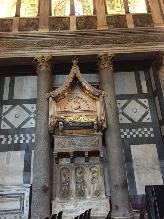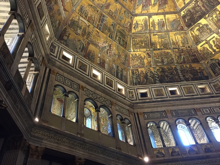 Зашли внутрь по билету, который покупали накануне. Очень красиво внутри! Все в расписи и мозаике! Убранство даже интересней, чем в Дуомо Санта-Мария-Дель-Фьоре.