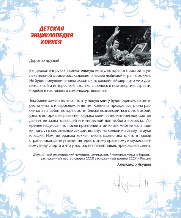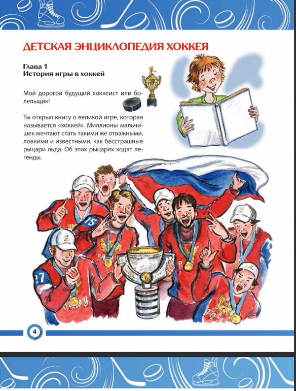 Авторы надеются, что, взяв в руки энциклопедию и шаг за шагом погружаясь в удивительный мир хоккея, многие мальчишки затем впервые возьмут в руки клюшку.