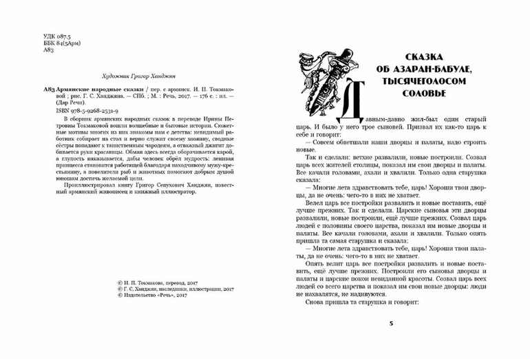 В сборник армянских народных сказок в переводе Ирины Петровны Токмаковой вошли волшебные и бытовые истории. Сюжетные мотивы многих из них знакомы нам с детства: невидимый работник собирает на стол и верно служит своему хозяину, сводные сёстры попадают к таинственным чародеям, а отважный джигит добивается руки красавицы. Обман здесь всегда оборачивается карой, а глупость наказывается, дабы человек обрёл мудрость: ленивая принцесса становится работящей благодаря находчивому мужу-крестьянину, а повелители рыб и животных помогают добрым душой юношам достичь желаемой цели.