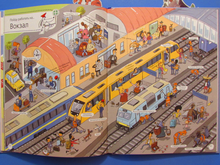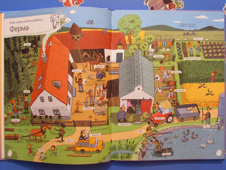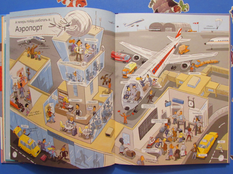 Книга «Профессии. Когда я вырасту, то стану…» представляет собой своеобразный виммельбух, с множеством деталей.