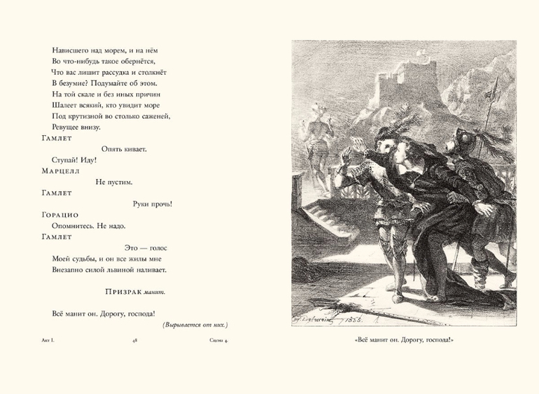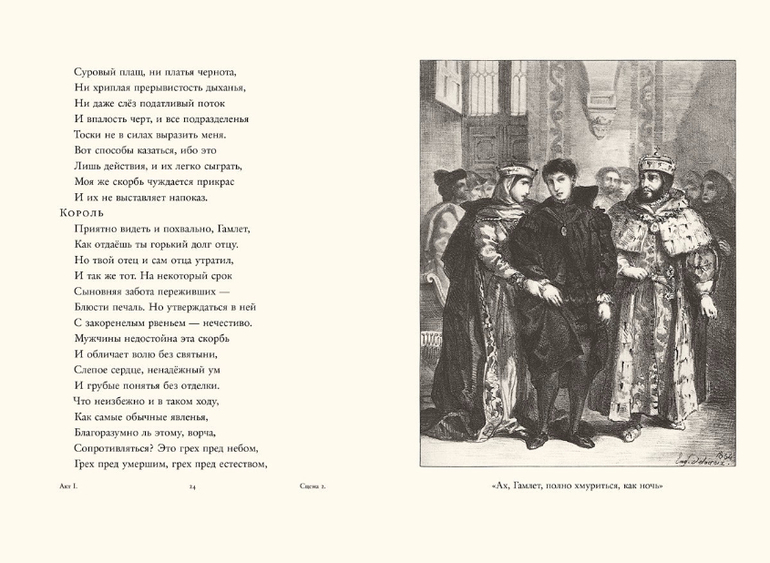 Издание с редкими литографиями Эжена Делакруа, французского живописца и графика. Художник создавал их в течение 9 лет - с 1834 по 1843 год. Проникнувшись духом шекспировских произведений, в том числе трагедии «Гамлет», он очень точно передал драматизм пьесы и душевные переживания героев.
