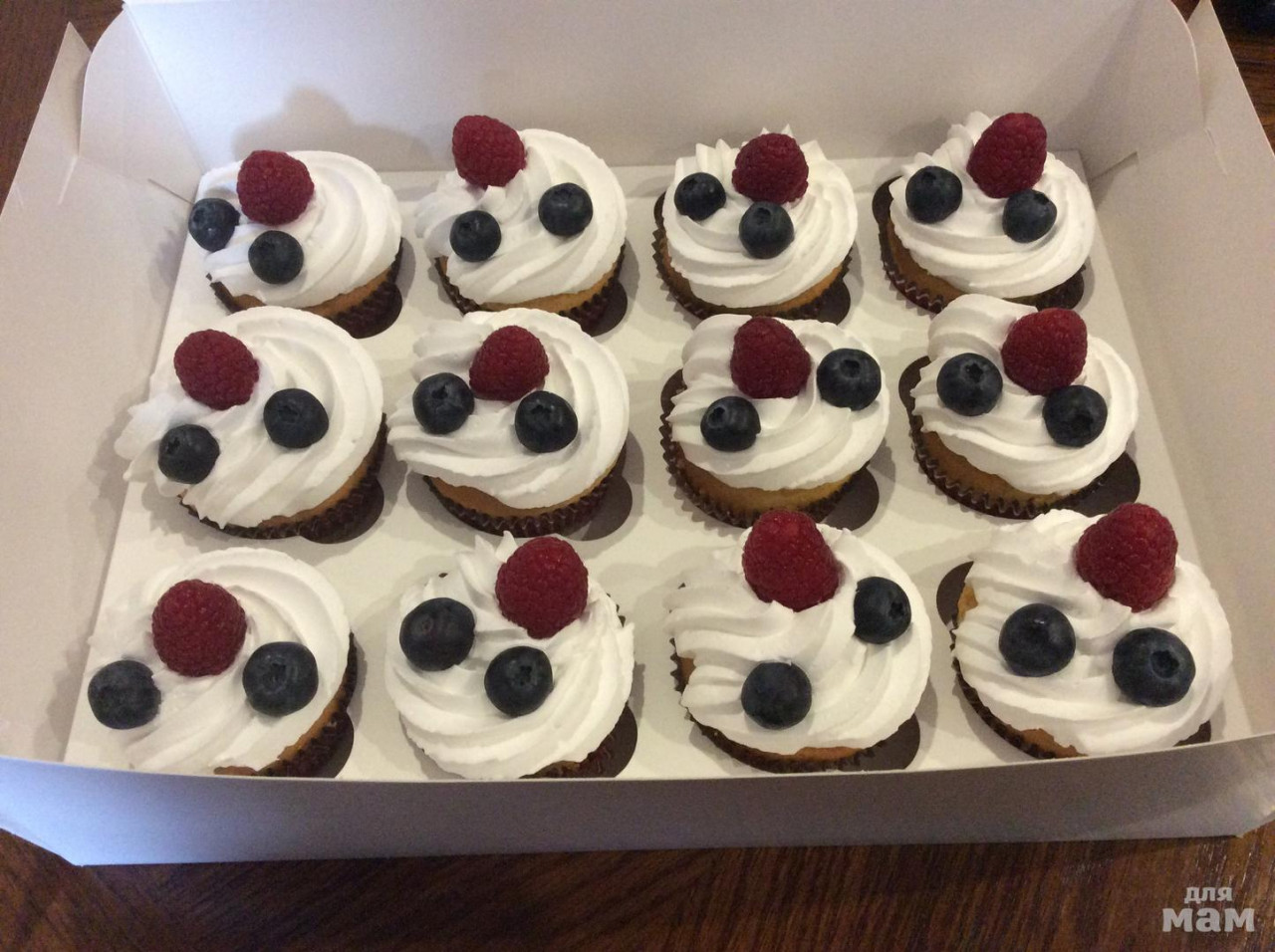 Ванильные кайпеки, внутри протёртая малина, сверху свежие ягоды. Рецепт брала здесь и теперь он у меня в моей копилке. http://julycupcakes.blogspot.ru/2011/09/vanilla-cupcakes
