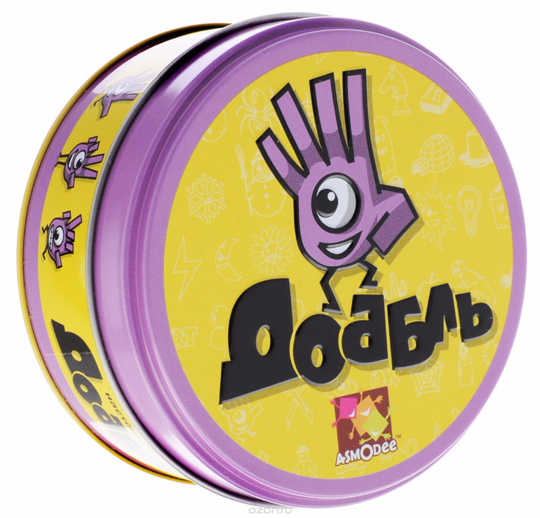 Игра для желающих повеселиться и проверить своё зрительное восприятие, внимательность и реакцию. Оригинальная круглая баночка содержит 55 карт с различными сочетаниями картинок. Каждая карта уникальна, но обязательно имеет один (и только один) общий рисунок с любой картой из колоды. Именно на поиске этого совпадения и построена настольная игра Доббль (Dobble или Spot It!). Правила предлагают 5 вариантов игры!