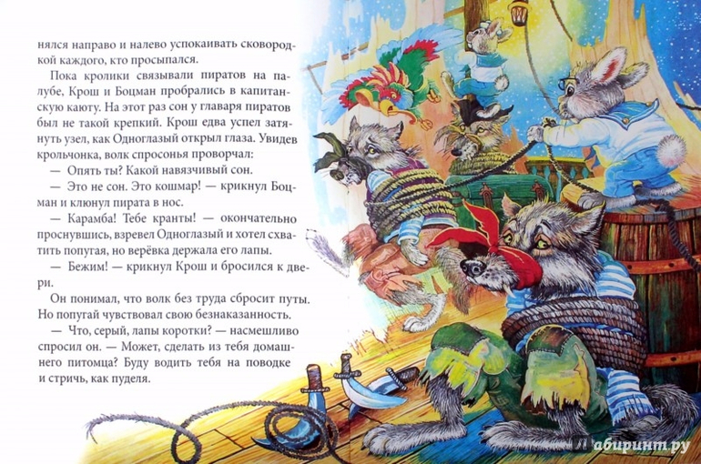 Знаете, как кролики попали в Австралию? Конечно же, они приплыли на корабле. В пути их поджидало немало опасностей. Им даже пришлось сражаться с пиратами - настоящими морскими волками. Но в конце концов капитан Панцирь и его помощник крольчонок Крош вместе со своим другом попугаем Боцманом оказались победителями.