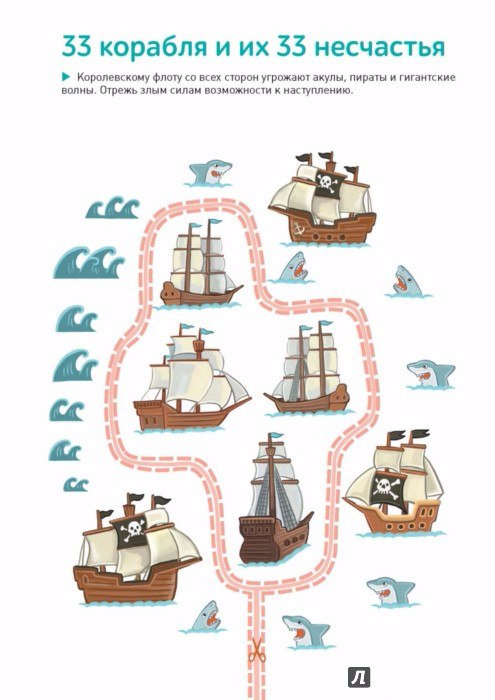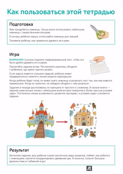 Эта тетрадь - сюжетная игра, которая поможет вашему ребёнку научиться вырезать. Он совершит путешествие по волшебному королевству, помогая его обитателям. Каждый лист тетради нужно разрезать так, чтобы выполнить задание.