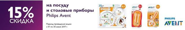 на детскую посуду из специального раздела от Philips Avent действует скидка 15%. Качественная и красивая посуда поможет Вашему малышу быстро и легко привыкнуть ко взрослой пище!