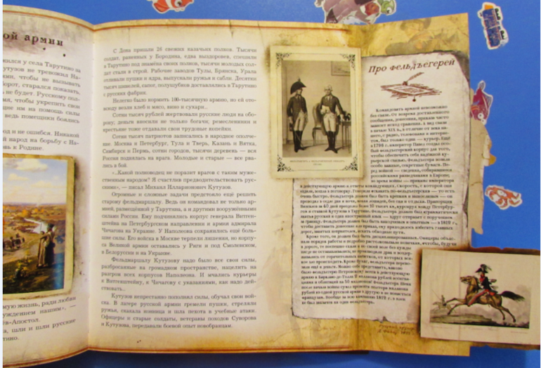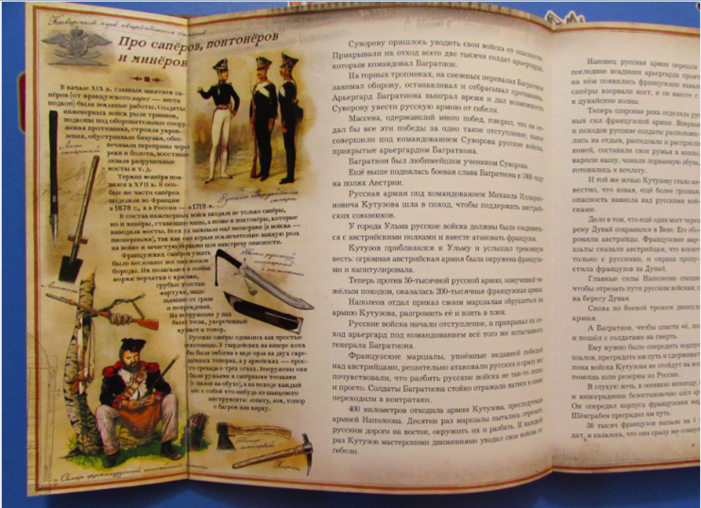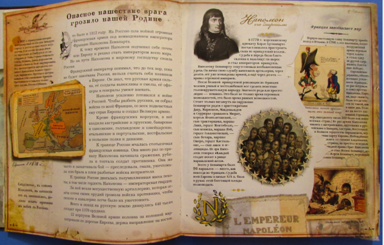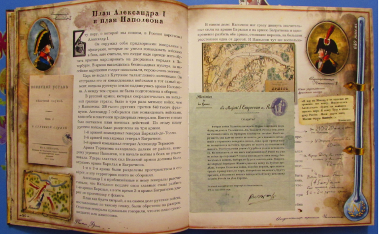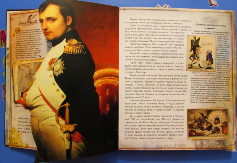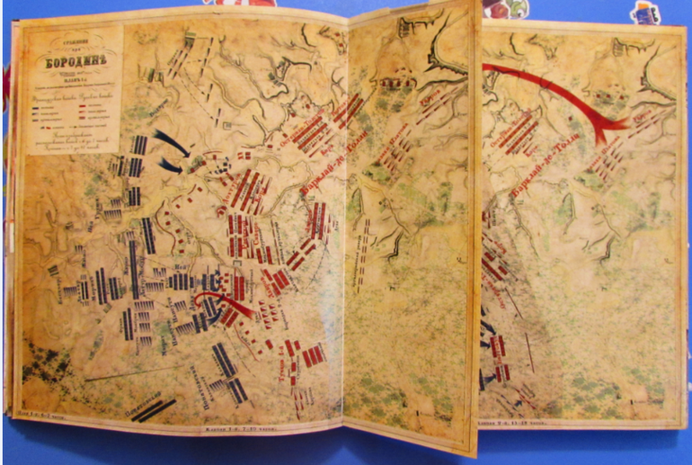 В книге находятся копии исторических документов (например, подлинная карта Бородинского сражения, напечатанная в XIX веке, С КЛАПАНАМИ, или фотография наполеоновского ветерана, сделанная в 1858 году).