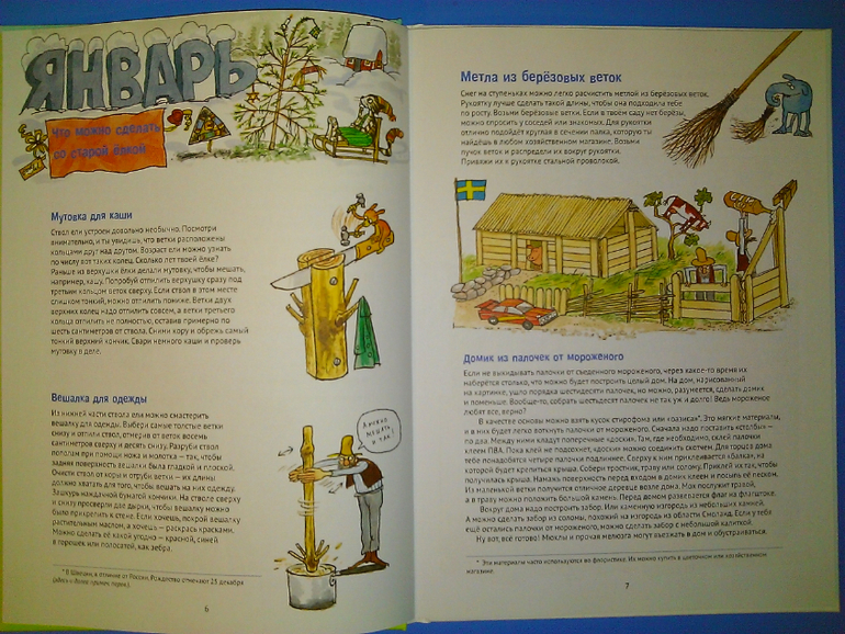 В январе Финдус вам предложит сделать вешалку для одежды из старой ели (это к папе) или домик из палочек от мороженного или необычный автомобиль.