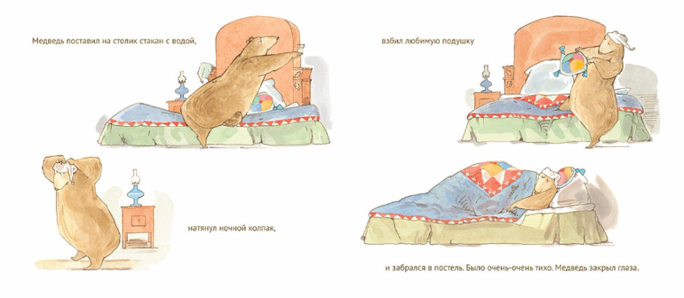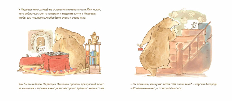 Вторая книга - «Медведю пора спать» - смешная на-ночь-глядя история о том, как Мышонок впервые остался ночевать в гостях у своего друга Медведя. Проведя прекрасный вечер за шашками и какао, они укладываются спать, причём Медведь всё время напоминает, как важна для него тишина. А Мышонок то нечаянно шуршит, чистя зубы, то нарочно поддразнивает Медведя, проверяя остроту его слуха. Обычное дело!