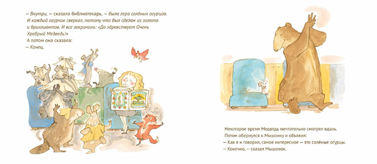 Медведь никогда не бывал в библиотеке. У него дома было семь хороших книжек: три про королей и королев, три про пчёл и одна - про солёные огурцы. Медведь был совершенно уверен, что больше никаких книг ему никогда не понадобится...