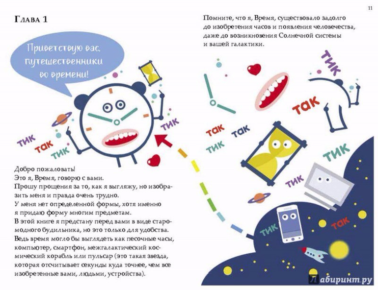 В этой книге я предстану перед вами в виде старомодного будильника, но это только для удобства. Ведь время могло бы выглядеть как песочные часы, компьютер, смартфон, межгалактический космический корабль или пульсар (это такая звезда, которая отсчитывает секунды куда точнее, чем все изобретенные вами, людьми, устройства).
