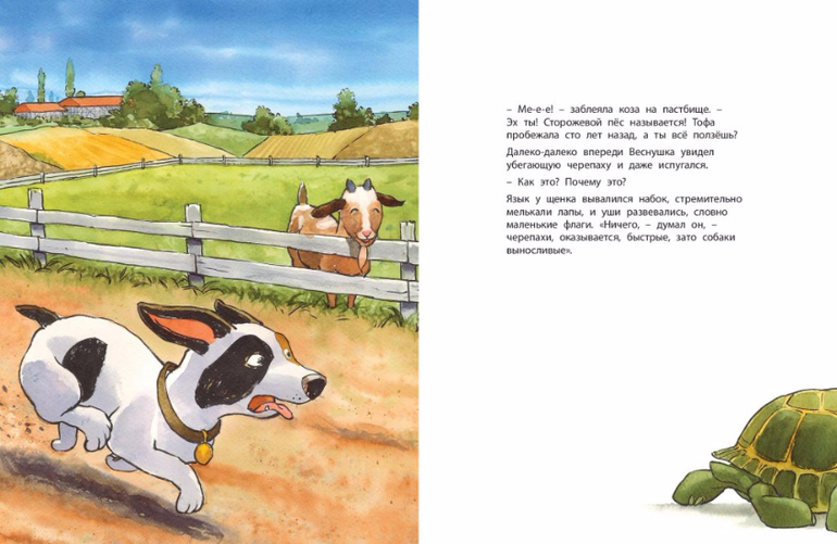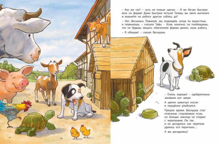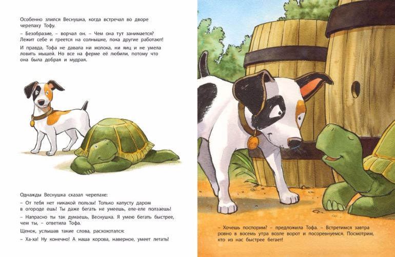Жил на ферме маленький щенок. Он очень старался быть настоящим сторожевым псом, но у него это ещё плохо получалось. Пока он только приставал к обитателям фермы и всем мешал заниматься своими делами. Однажды черепаха решила проучить глупого щенка и предложила ему посоревноваться… в беге! Щенок долго смеялся, но состязание, как ни удивительно, проиграл. Он подрос, стал отличным сторожем, но так и не догадался, как черепахе удалось его перегнать. Чтобы разгадать секрет черепахи, надо прочитать эту книжку…