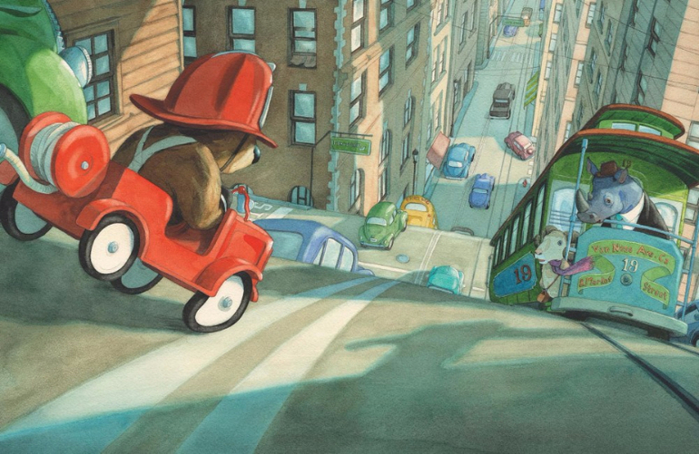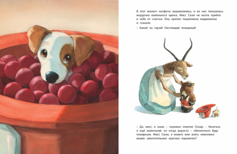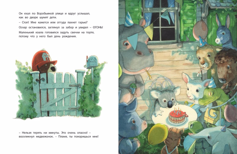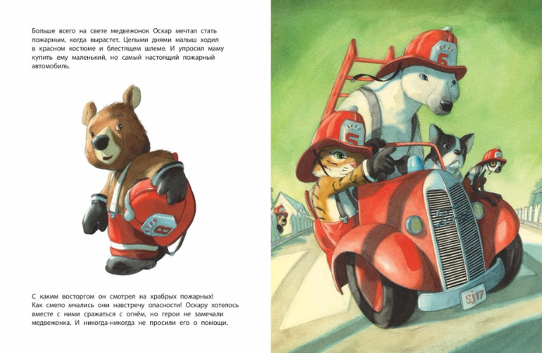Маленький медвежонок мечтал стать пожарным. Он целыми днями ходил в красном костюме и блестящем шлеме и с восторгом смотрел на настоящих пожарных, когда они смело мчались навстречу опасности. Малышу хотелось вместе с ними сражаться с огнём, но никто не просил его о помощи. И вот он уговорил маму купить ему маленький, но самый настоящий пожарный автомобиль. Поначалу незадачливый герой натворил немало бед, но в конце концов ему удалось совершить настоящий подвиг…