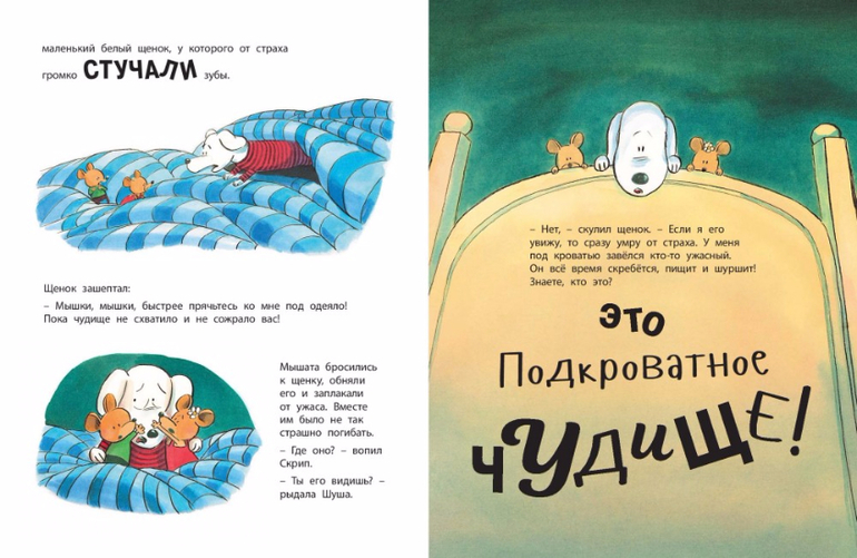 Чудовища бывают разные. Вот одной мышиной семье пришлось встретиться с Накроватным чудовищем - оно сопело, пыхтело и шевелилось под одеялом. А одному маленькому щенку - с не менее ужасным Подкроватным чудовищем - оно скреблось, пищало и шуршало под кроватью... Интересно, а маленький читатель сумеет догадаться, что же так напугало очаровательных героев этой книжки?