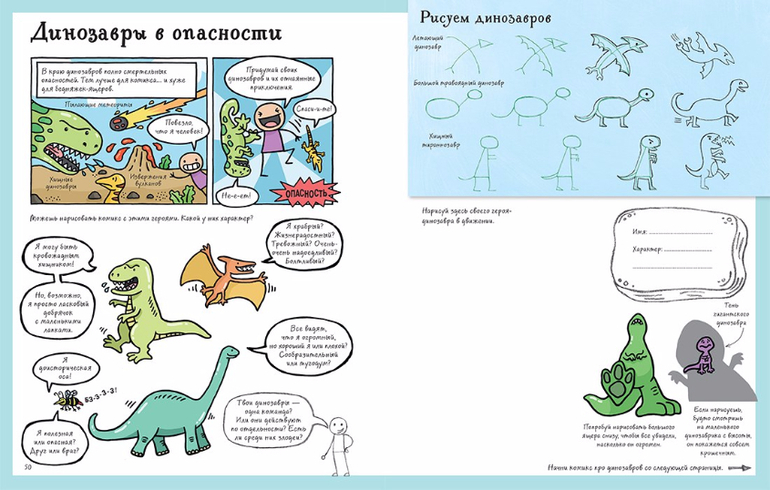 Выполнив упражнения, ребенок сможет сам нарисовать комиксы по предложенным темам - от шпионского детектива до одного дня в школе котиков. Но что именно произойдет в этих историях, зависит только от фантазии юного комиксиста.