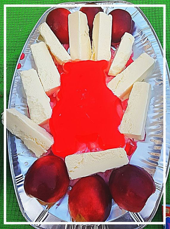Перед подачей разрезайте нектарин пополам, достаем косточки, выкладываете мороженное, берете застывшего (мишку), на 30 секунд силиконовую форму нижней частью погружаете в кипяток, желе отойдет от силинона и красиво разольется на блюдо. Важно! не передержать! иначе ваши детали на форме расплывутся.Его можно подать детям как завтрак.
