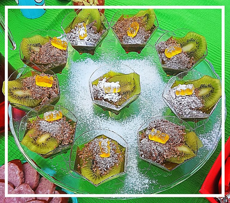 Забываем на 2 часа. Примерно через 2 часа перед подачей, посыпаем тертым шоколадом, выкладываем мишек, сверху присыпаем сахарной пудрой. Отличное блюдо для лета. Имеет кисло-сладкий вкус, киви придаем экзотики. Детям было очень интересно, т.к. он многослойный. Слопали практически все сразу. Отлично подходит к кофе к зеленому чаю, думаю и черный чай подойдет, приятный десерт, который не доставляет много трудов в приготовлении.